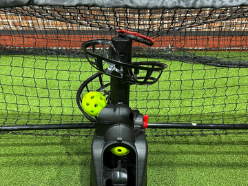 Your toss machine includes a ball rail. Please remove the ball rail completely when using the auto-return net. If the rail is left on, it will block the net and balls will not return.