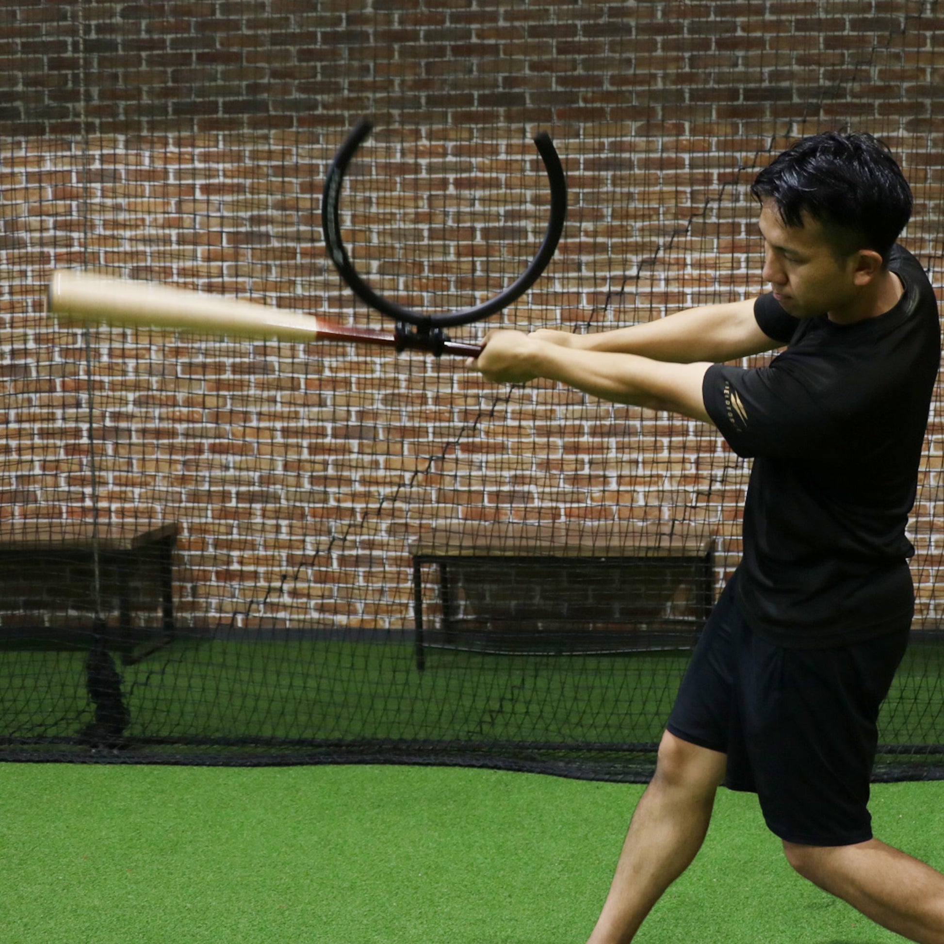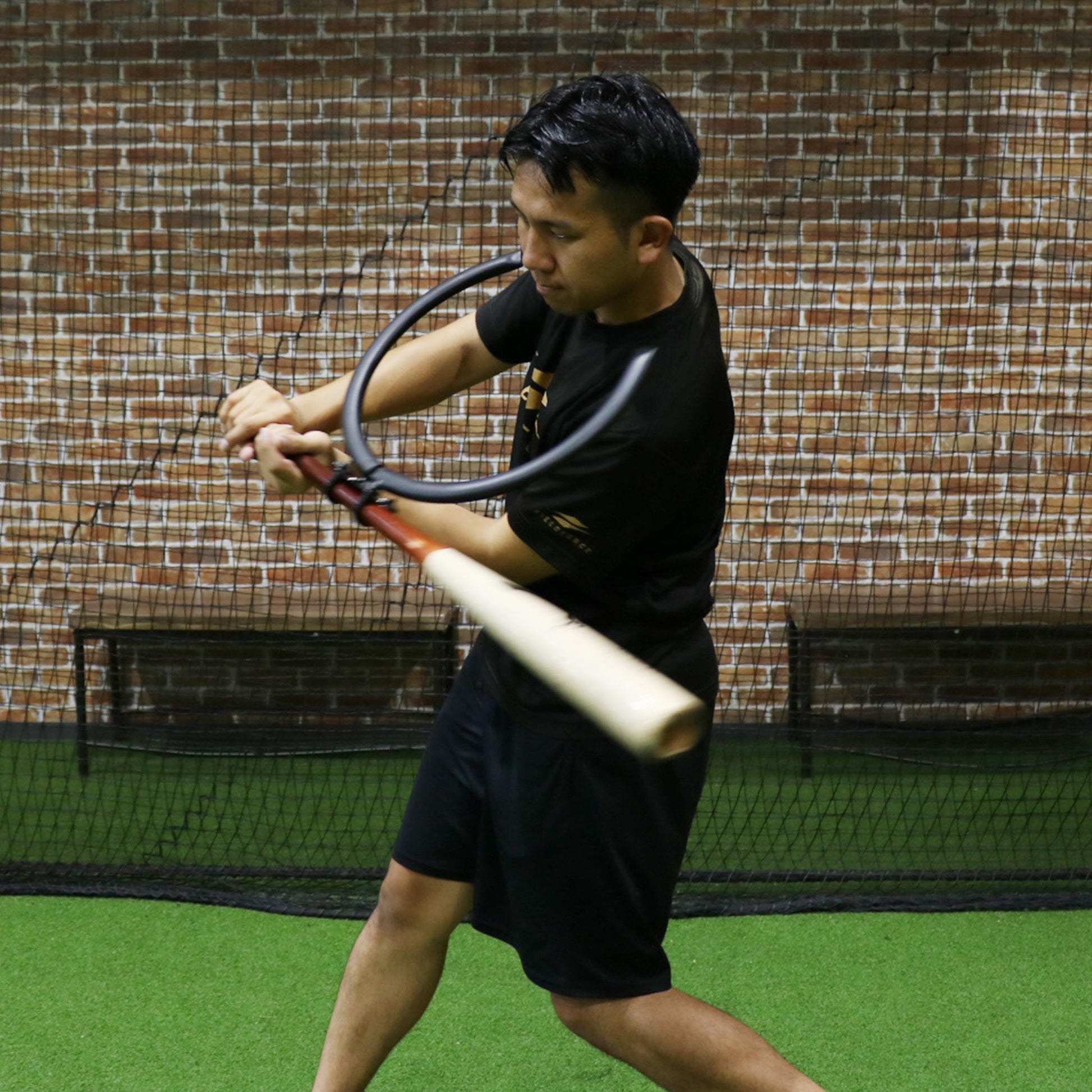 To swing properly with the ring, you must use your core and whole body. If you try to swing only with your hands, the bat will bump into your body. This forces you to use correct mechanics.